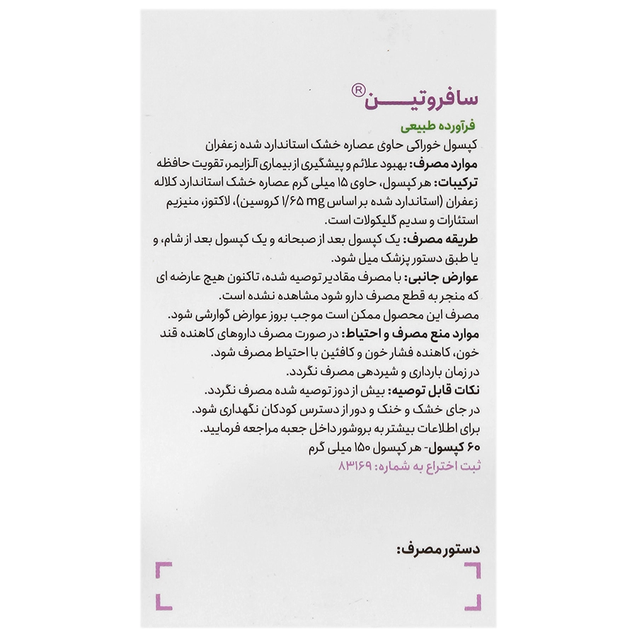 سافروتین، حاوی 60 کپسول و مناسب برای استفاده به مدت 30روز می‌باشد.