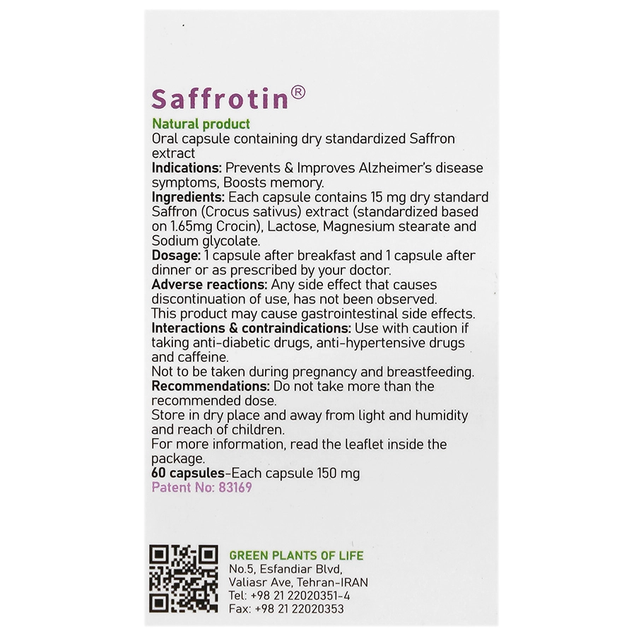 کپسول سافروتین یک فرآورده طبیعی حاوی عصاره خشک استاندارد کلاله زعفران است که توسط شرکت گیاهان سبز زندگی در ایران تولید شده و در قوطی‌های پلاستیکی ۶۰ عددی عرضه می‌شود. این مکمل با بهره‌گیری از خواص زعفران، به‌ویژه ماده موثره کروسین، به کاهش علائم بیماری آلزایمر، بهبود خلق‌وخو و کاهش علائم افسردگی خفیف تا متوسط کمک می‌کند. سافروتین به دلیل خواص آنتی‌اکسیدانی قوی، از سلول‌های مغز در برابر آسیب‌های ناشی از رادیکال‌های آزاد محافظت کرده و در تقویت حافظه و عملکرد شناختی مفید است. سافروتین با کد بهداشتی معتبر، در گروه مکمل‌های مرتبط با آلزایمر قرار گرفته و برای افرادی که به دنبال راه‌حل‌های طبیعی برای حمایت از سلامت مغز هستند، مناسب است. سافروتین به دلیل ترکیبات فعال زعفران، مانند کروسین و سافرانال، به بهبود عملکرد سیستم عصبی، کاهش استرس و اضطراب و تقویت سلامت عمومی مغز کمک می‌کند. این مکمل برای سالمندان، افراد در معرض کاهش عملکرد شناختی و کسانی که از افسردگی خفیف رنج می‌برند، توصیه می‌شود. مصرف منظم سافروتین می‌تواند به بهبود کیفیت زندگی، افزایش تمرکز و کاهش علائم اختلالات خلقی کمک کند. همچنین، خواص آنتی‌اکسیدانی آن در پیشگیری از آسیب‌های عصبی و بهبود سلامت عمومی بدن نقش دارد.